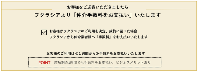またオフィス仲介(不動産業)の方から、ご送客(ご紹介)頂いた場合、「紹介手数料」を支払うサービスも同時に展開。ご利用いただくお客様にも、ご紹介頂く企業様にも、両者に貢献できるサービスとなっております。