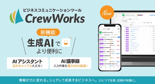 ビジネスチャット・タスク管理・Web会議・ファイル共有を統合、成果を最大限に引き出す革新的なサービスであるCrewWorksが、AIアシスタント機能とAI議事録機能を提供開始しました。