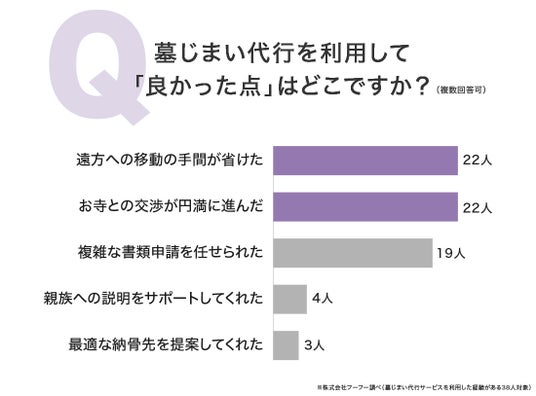 代行サービスを利用して良かった点を尋ねたところ、上位は「遠方への移動の手間が省けた」「お寺との交渉が円満に進んだ」でした。