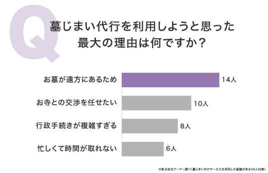 代行サービス利用者38人に「利用しようと思った最大の理由」を尋ねたところ、最多は「お墓が遠方にあるため」14人(36.84%)でした。