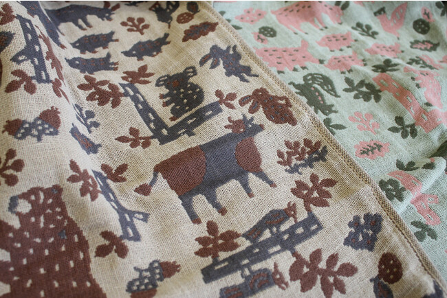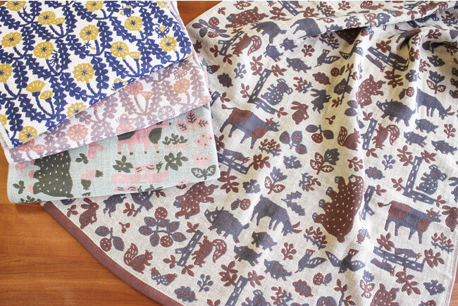 コラボレーションの第1弾となる商品は、ガーゼ素材で2柄、パイル素材で1柄の合計3種類。