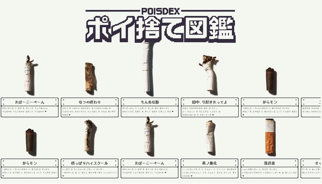 「ポイ捨て図鑑プロジェクト」は、ポイ捨てされた吸い殻を“喫煙所に戻れず、迷子になった吸殻モンスター “ といった助けるべき存在として描き、誰もが簡単にゲーム感覚で参加できるポイ捨て問題の解決を目指すプロジェクトです。ポイ捨てされた吸殻を撮影し、位置情報と併せて投稿を行うことで、街のポイ捨て状況を可視化します。