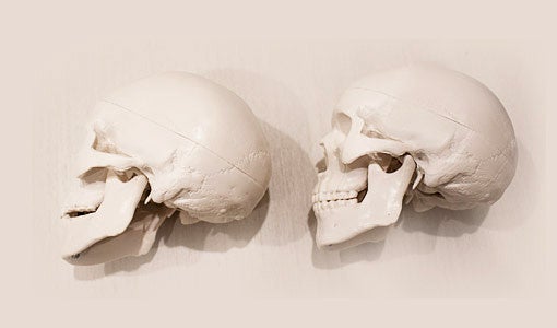 左:奥歯の歯ぎしりや欠損のため顎関節が上にずれている右:歯並びをよくするには顎関節を正しい位置に戻すことが大事なポイント