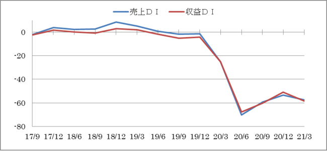 総合では、売上DIが-53.6(前回比+5.8ポイント)、収益DIが-51.1(前回比+9.1ポイント)となり2期連続の上昇となりました。売上DIは、小売業が16.5ポイント、運輸業が15.9ポイント、卸売業が13.6ポイント上昇しましたが、飲食業では0.6ポイントに止まりました。