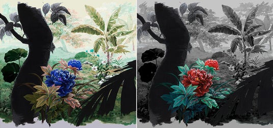 左:オートクチュール着物「楽園」/右:長襦袢「花鳥」