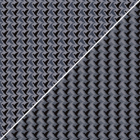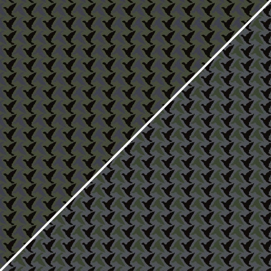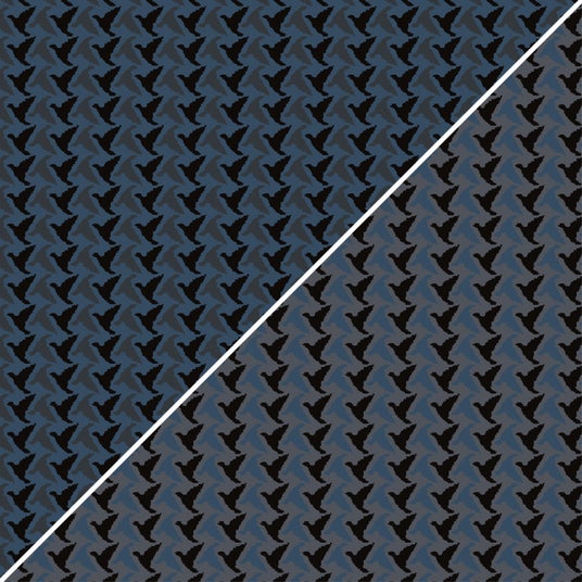羽ばたく鳥のシルエットが連続するデザイン。職人の手技による地染め(刷毛染め)と、モチーフが成立する限界まで小さく緻密に表現したプリント技術を融合。模様の細密さと配色の妙で、一見すると織物のような印象に。