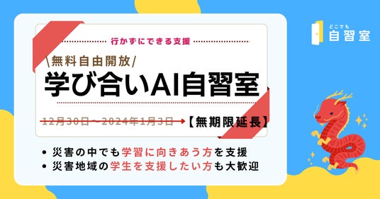 年末年始(2023年12月30日~2024年1月3日)、HANATABAはAIサポート付きオンライン自習室「AI龍」を無料開放しました。この度、震災の影響を受けた受験生の学習環境サポートを目的とし、無期限延長することとなりましたので、ご報告させていただきます。