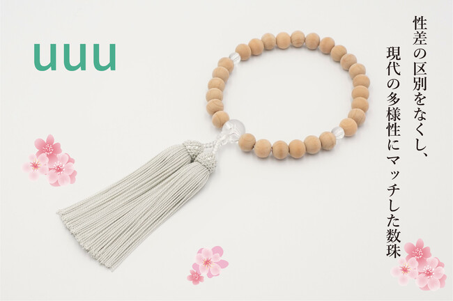 ジェンダーレス数珠uuuは、「数珠を通して多くの人の心を豊かにする」という企業理念のもと、男性・女性・性的マイノリティの方などすべての人が使用できるジェンダーレスな数珠で、特にジェンダー問題に精力的に取り組んでいる学校向けの記念品として作り上げた数珠です。名前の由来は「ユニセックス」「ユニーク」「ユニバーサル」をコンセプトにその頭文字である「u」を3つ繋げています。