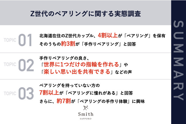株式会社 一宝(本社:北海道札幌市、代表取締役:懸谷 正人、以下 工房Smith札幌店)が運営する、手作り結婚指輪・婚約指輪・ペアリング工房「工房Smith札幌店」は、パートナーがいる北海道在住のZ世代(18~26歳)の男女109名を対象に、Z世代のペアリングに関する実態調査を実施しましたので、お知らせいたします。