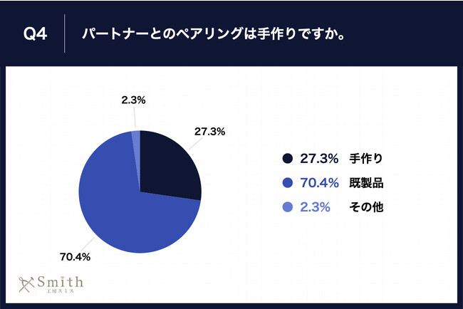 Q1で「持っている」と回答した方に、「Q4.パートナーとのペアリングは手作りですか。」(n=44)と質問したところ、「手作り」が27.3%、「既製品」が70.4%という回答となりました。