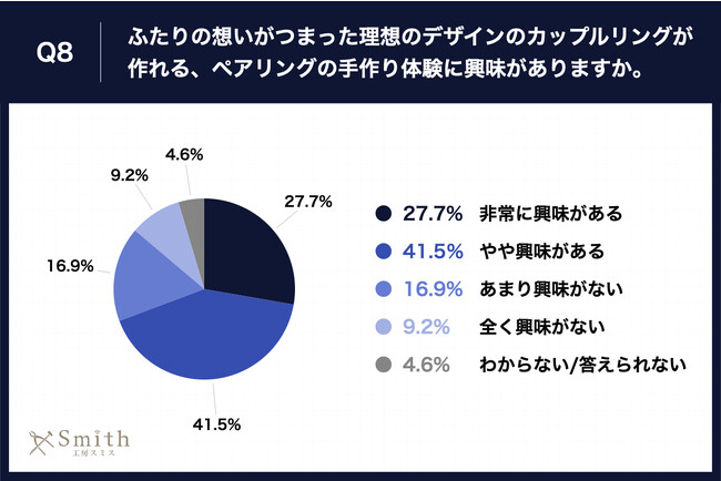 Q1で「持っていない」と回答した方に、「Q8.ふたりの想いがつまった理想のデザインのカップルリングが作れる、ペアリングの手作り体験に興味がありますか。」(n=65)と質問したところ、「非常に興味がある」が27.7%、「やや興味がある」が41.5%という回答となりました。
