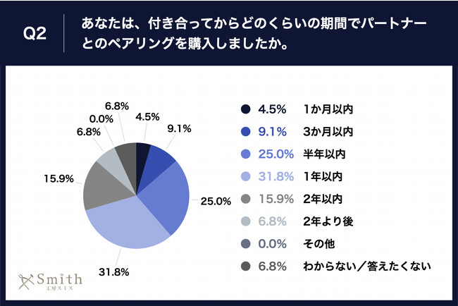 Q1で「持っている」と回答した方に、「Q2.あなたは、付き合ってからどのくらいの期間でパートナーとのペアリングを購入しましたか。」(n=44)と質問したところ、「半年以内」が25.0%、「1年以内」が31.8%という回答となりました。