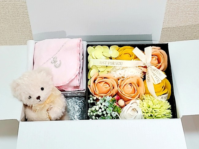 華やかな見た目と優しい香りを楽しんで頂けるソープフラワーや、ご希望のイニシャルを刺繍したハンドタオル、伝えたい感謝のメッセージをプリントした「たったひとつ」のテディベアを詰めこんだ、大切なお母さんに届けるギフトです。