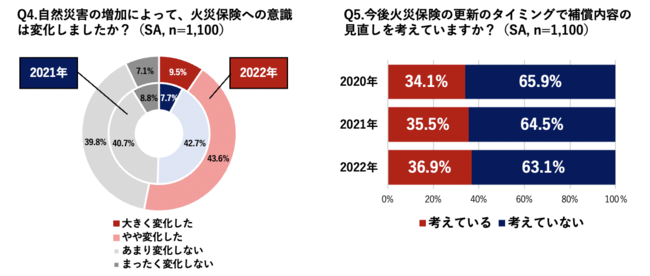 ・近年の水災増加を反映してか、火災保険への意識が変化した人は2021年調査より2.6ポイント増加し、水災補償を充実させたい傾向に。