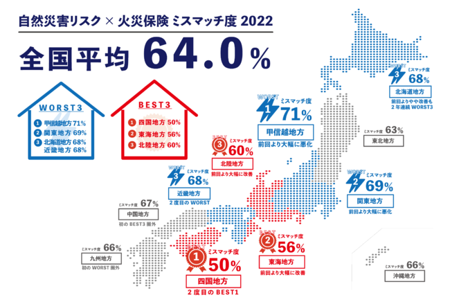 全国の11地域(北海道・東北・関東・北陸・甲信越・東海・近畿・中国・四国・九州・沖縄)別の自然災害リスクと火災保険の補償内容のミスマッチ度ランキングでは、昨年ベスト1位を記録した「甲信越地方(71.0%)」がワースト1位という結果となりました。また、「北海道地方(68.0%)」は2年連続でワースト3にランクインするなど、継続してミスマッチ度が高いことが判明。