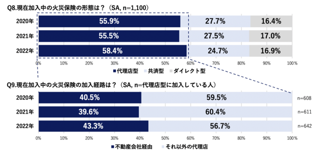 調査対象の1,100の持家家庭のうち、代理店型の火災保険に加入している世帯は全体の58.4%と昨年より2.8ポイント増加し、一方でダイレクト型は昨年とほぼ同水準の16.9%という結果になりました。