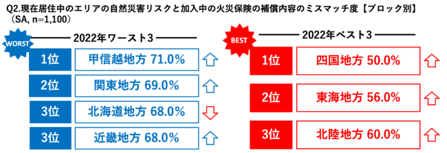 ・また、地域別のミスマッチ度ランキングにおいて、2020年と2021年ではどちらも九州地方がワースト1位であったが、今年は甲信越地方(71.0%)が最もミスマッチ度が高い結果に。中でも水災補償でのミスマッチが多く見られた。