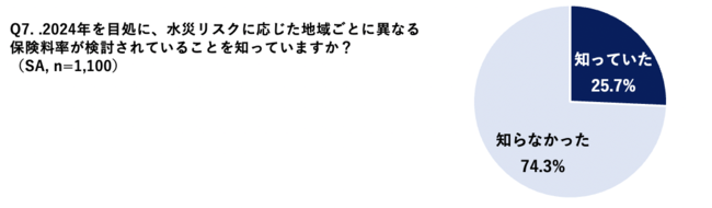 2024年を目処に、地域別の水災リスクに応じた保険料率の導入が検討されていることについて、知っていると答えた人は25.7%と、全体の7割以上の人が知らないということが判明しました。