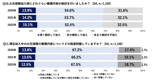 また、84.9%の世帯が火災保険に加入する際、深く検討していないと回答し、3年連続で全体の8割を超える世帯が火災保険を深く検討せずに加入しているという実態がわかりました。加えて、現在加入中の火災保険の補償内容を完全に把握している人は12.5%と昨年より減少。依然として火災保険に対する意識が高くない人が多いことが調査からうかがえます。