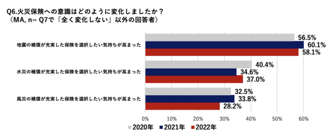 全体の53.1%の人が、自然災害の増加を受けて火災保険への意識が変化したと回答。前年比減少傾向だった昨年とは異なり、2021年調査から2.6ポイント増加する結果となり、近年の自然災害増加が防災への意識に影響を及ぼした結果となりました。