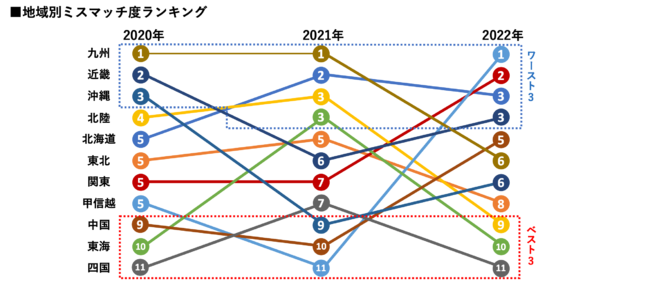・ミスマッチ度が低かったベスト3は、1位「四国地方(50.0%)」、2位「東海地方(56.0%)」、3位「北陸地方(60.0%)」。どの地方も昨年よりミスマッチ度が減少。