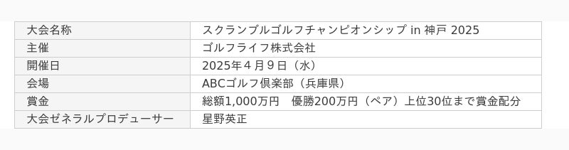 国内最大級のスクランブルゴルフ競技大会、「スクランブルゴルフツアー」を主催・運営しているゴルフライフ株式会社(本社:東京都渋谷区、代表取締役社長:田島光敏)はプロゴルファーの星野英正プロと共に「スクランブルゴルフチャンピオンシップ in 神戸 2025」を開催いたします。