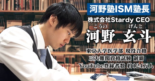 河野玄斗は、東京大学理科三類医学部に現役合格。在学中に司法試験に合格し、医師国家試験にも合格。2022年、公認会計士に挑戦し11月資格を取得。「東大医学部の神能」と呼ばれた東大医学部在学中から教育系ユーチューバーとして「Stardy河野玄斗の神授業」をスタート。タレントとしても各メディアに出演。河野玄斗のYouTubeは登録者数124万人(2024年8月現在)を誇り、今も自ら学び挑戦する姿に多くの支持を得ています。