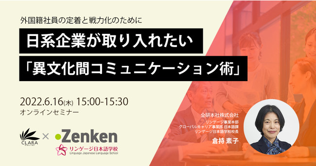 日中ビジネス人材に特化したハイクラス転職スカウトサービスを手掛ける株式会社クララオンライン(本社:東京都港区 代表取締役:家本賢太郎 以下「クララオンライン」)は、企業向けのビジネス日本語研修や異文化理解・マナー研修を実施する全研本社株式会社(本社:東京都新宿区、代表取締役社長:林 順之亮)のリンゲージ事業本部と共同で、「外国籍社員の定着と戦力化のために日系企業が取り入れたい“異文化間コミュニケーション術”」セミナーを6月16日(木)に開催いたします。