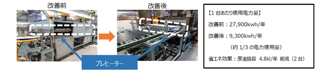 連続的に流れる鉄板を温める工程(プレヒーター)で、従来は電熱線ヒーターを使用し循環ファンで炉内温度を調整していた。また、装置は箱状で設備が大きく、鉄板が通過しない待機中でも常に温めておく必要もあり電気使用量が多かった。これを直接鉄板を加熱する高周波電磁誘導方式へ変更し、電気使用量を大幅に削減した。2022年度は2ラインの計2台について実施。