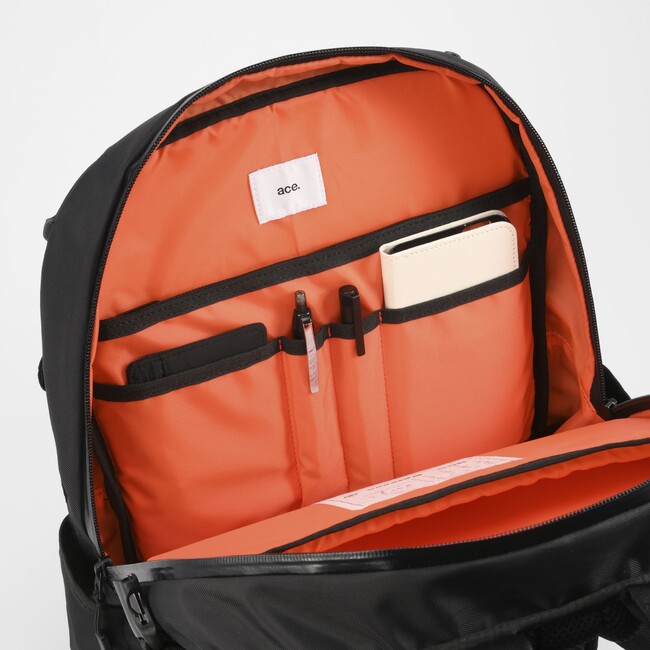 内装の生地にはライフジャケットを意識した、明るいオレンジ色を採用。視認性に優れているので薄暗い場所でも中が見やすく、荷物の取り出しや整理のストレスから解放してくれる設計デザインです。
