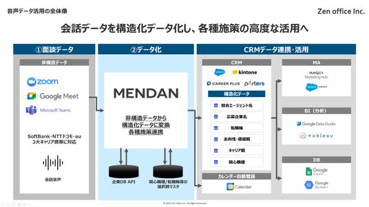 「MENDAN」は、人材紹介業務における面談・通話の会話データをAIで構造化し、CRM連携・マッチング・分析といった業務プロセスに展開する人材紹介特化の音声×AIエージェントです。