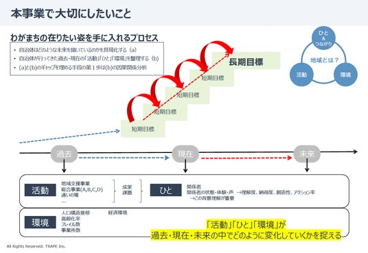 - - 現在の状況や過去の出来事を「ひと」「活動」「環境」という視点で整理・解釈し、未来には手に入れたいわがまちの在りたい姿(長期目標)に向かうための段階的なマイルストーン(短期目標)を設定していき、1段ずつ登っていけるデザインづくりを行う
