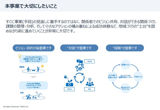 株式会社TRAPEは「素敵な役割のあふれる日常を創る」をビジョンに掲げるており、well-beingデザインを通じて人々、組織、地域に新たな可能性や価値を提供しています