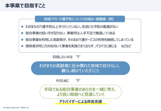 この事業は、岡山県内の市町村が行う介護予防事業の更なる充実を図るため、対象となった3市町にアドバイザーを派遣し、現地での支援3回とオンラインでの支援3回の計6回の支援を実施することで、目指す地域の状態へ向かうための本質的な取組が可能となるよう伴走支援を行い、市町村が行う事業の改善や推進を図ることを目指します。
