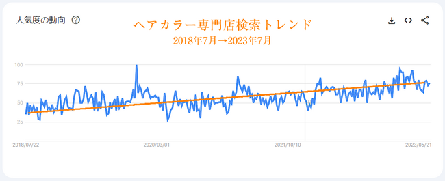 白髪染め専門店・ヘアカラー専門店がインターネットでどれくらい検索されているか?以下のように2018年7月から5年間で拡大しています。(以下はGoogleトレンドより)