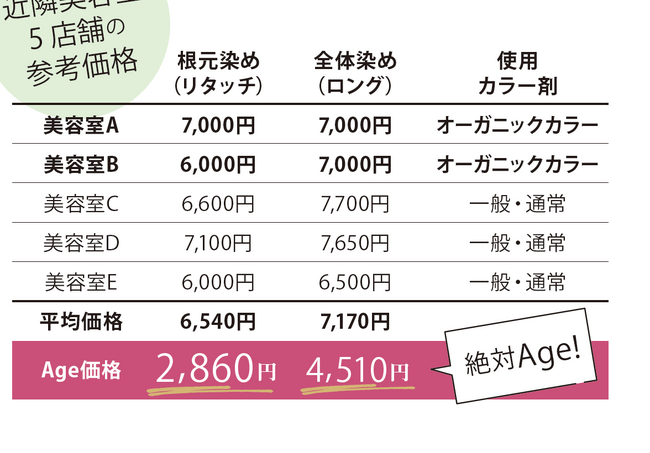 白髪染めヘアカラー専門店は、前出「業務効率化」としてオンライン予約・オートシャンプー・勤怠業務管理ツールのクラウド化・電子決済とクラウド会計などを活用することで、一般的な理美容室よりお得な価格と最適な施術時間を実現しています。以下は特定エリアでの一般的な理美容室の料金調査と私どものサービス提供価格の比較表です。(※私どもでは天然由来成オーガニックカラー剤を使用しています)