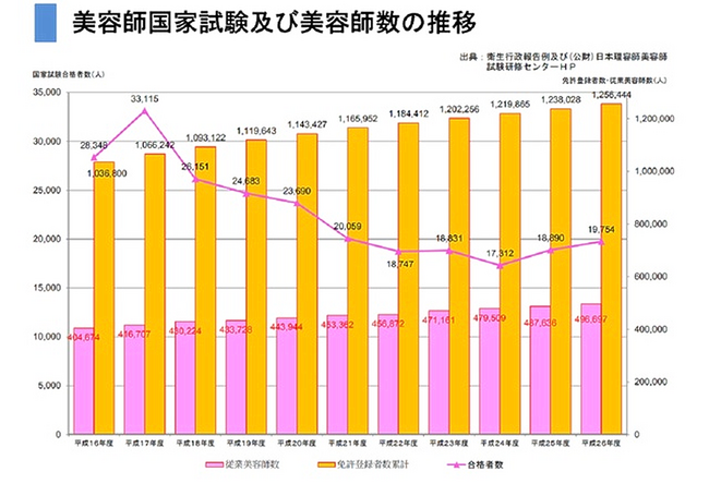 国家資格である理美容師免許の取得者数と就労者数を示す厚生労働省が発表した「美容師国家試験及び美容指数の推移」のグラフ(以下)です。理美容師資格をもちながら美容の仕事に就いていない休眠美容師の数が、就業した美容師よりも多いのが現状。就労可能な理美容師が増加している。