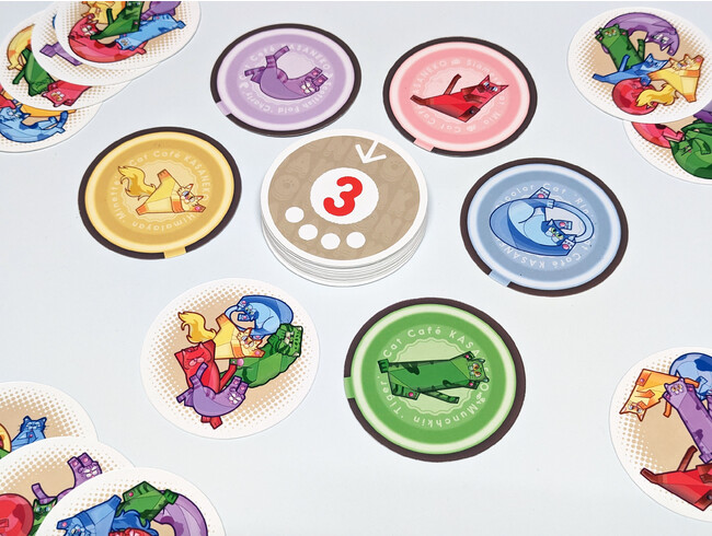 見た目もかわいい『ねこカフェ カサネコ』のカードは、ネコの重なる絵の入った『ねこカード』と、正解となる1匹のネコが描かれた『取り札』の2種類。それぞれちょっと大きめの円形カードで見た目もかわいいです。さらに『取り札』となるネコの描かれたカードをよく見ると……ちゃんと”ねこカフェ”っぽくコーヒーカップ状になっています。『ねこ鍋』ならぬ『ねこコーヒー』なのです。 ※ねこは飲まずに吸いましょう