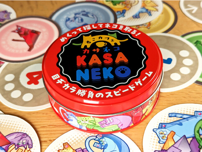 『ねこカフェ KASANEKO(カサネコ)』は、重なりあうねこの描かれたカードの中から、お題となる1匹を探して素早く正解の取り札を取るゲームです。1分でルールが分かる超シンプルなゲーム性に、正解となる猫を探し、そして正しい取り札を取るための観察力、探索力、空間認識能力などが試される、超カンタンで超盛り上がる! 目ヂカラ勝負の新感覚ねこカードゲームです。