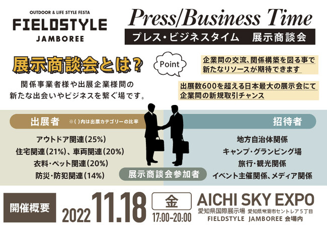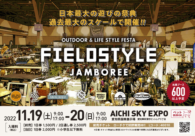 FIELDSTYLE works(代表 小池知宏、愛知県豊田市 株式会社エムズカンパニー)は、2022年11月19日(土)~20日(日)に AICHI SKY EXPO 愛知県国際展示場の展示ホール+屋外の広大なスペースを利用した"日本最大の遊びの祭典"「FIELDSTYLE JAMBOREE」を出展総数600以上のブースと新規コンテンツを用意して開催致します。