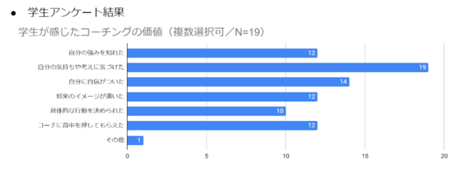 実施後アンケートでは、学生が感じたコーチングの価値として「自分の気持ちや考えに気付けた」の声が最も多いことがわかりました(アンケート回答者全員が回答)。次いで「自分に自信がついた」、「将来のイメージが沸いた」などが挙げられています。