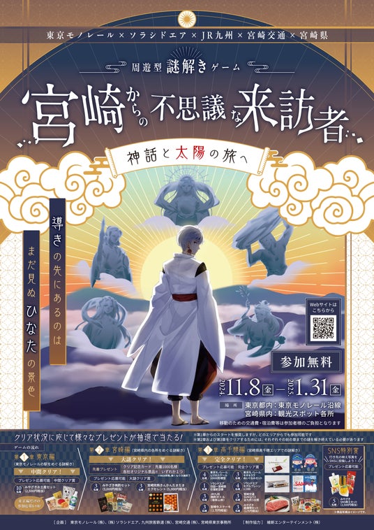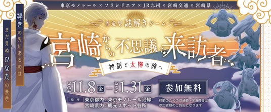 東京モノレール・ソラシドエア・九州旅客鉄道・宮崎交通・宮崎県は合同で、周遊型謎解きゲーム『宮崎からの不思議な来訪者―神話と太陽の旅へ―』を2024年11月8日(金)より開催いたします。