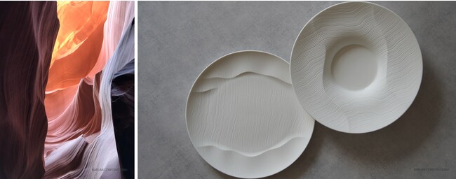 自然のダイナミズムを表現しつつも、ボーンチャイナ製の器ならではの上質さも持ち、ラグジュアリーホテルのファインダイニングにもよく合います。プレートとボウルのサイズ展開も豊富で、それぞれに料理の魅力を最もよく引き出すリム幅と深さを計算してデザインされています。美しいレリーフをキャンバスとして、シェフの自由な発想でお使いいただけます。