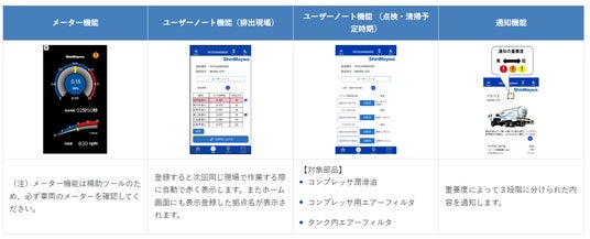 タンク内圧力やコンプレッサ回転数の異常、ユーザーノート機能で登録した値や日付を超えた場合に通知します。稼働時に生じがちなトラブルの早期発見が可能となり、万が一のトラブルの際にもサポート情報を活用することができます。