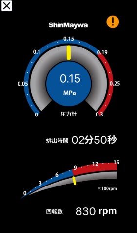 タンク内圧力、コンプレッサ回転数、排出時間の参考値をスマートフォンに表示します。