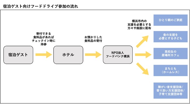 これまでは毎月特定の時間、横浜のまちに住む方を対象に参加の呼びかけと受付を行ってきましたが、今回、さらに多くの方に活動を知っていただけるようにと、広くホテルを訪れる宿泊ゲストもフードドライブ活動に気軽に参加いただける仕組みを展開します。ホテルの特性である、365日いつでも開かれた場所であるということ、また全国各地から毎日多くのゲストを迎えている点を生かした取り組みです。