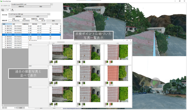 ChronoSky Eyesは、ドローンを利用した点検業務において『3次元地図を利用した精密な飛行計画作成』『仮想空間上での計測作業』『撮影写真の効率的な管理・閲覧機能』を提供します。