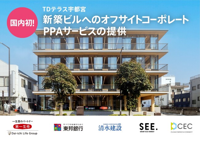 脱炭素経営企業、RE100参加企業等のお客様に対してNon-FIT太陽光発電によるグリーン電力と環境価値をお届けする株式会社クリーンエナジーコネクト(代表取締役:内田鉄平、以下「クリーンエナジーコネクト」)は、第一生命保険株式会社(代表取締役社長:稲垣精二)、株式会社東邦銀行(取締役頭取:佐藤稔)が、栃木県宇都宮市において共同で開発した「TDテラス宇都宮」の竣工にあわせ、スマートエコエナジー株式会社(代表取締役:高井裕之)と連携・協業し、建物の新築時から追加性のある再生可能エネルギー電力の環境価値を長期にわたって提供するオフサイトコーポレートPPAサービス契約を開始しました。