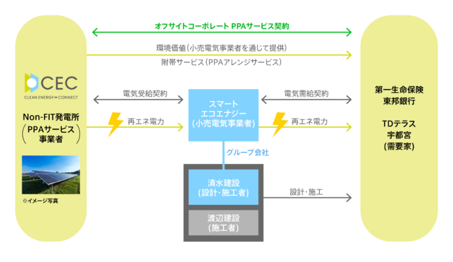 クリーンエナジーコネクトは、TDテラス宇都宮の敷地から離れた別の敷地に同建物専用の太陽光発電所を整備し、送配電網を介して、発電した電力と環境価値を提供します。本サービスにより、需要家である第一生命保険と東邦銀行は、2022年10月から20年間にわたって長期・安定的に再エネ受給が可能となります。