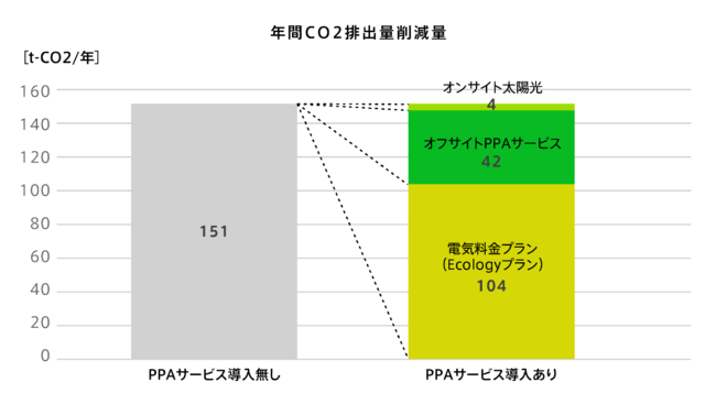 TDテラス宇都宮における電力由来のCO2排出量は年間約151t-CO2と想定されますが、本取組によるCO2排出量の削減効果は、追加性のある再生可能エネルギーによる、オンサイト太陽光発電設備により4t-CO2(3%)およびオフサイトコーポレートPPAサービスにより42t-CO2(28%)、また追加性のある再生可能エネルギーで賄いきれない電力使用量に対しては、スマートエコエナジーのEcologyプランによる再生可能エネルギーの提供により104t-CO2(69%)となります。これにより電力由来のCO2排出量を100%削減するとともにRE100を実現します。